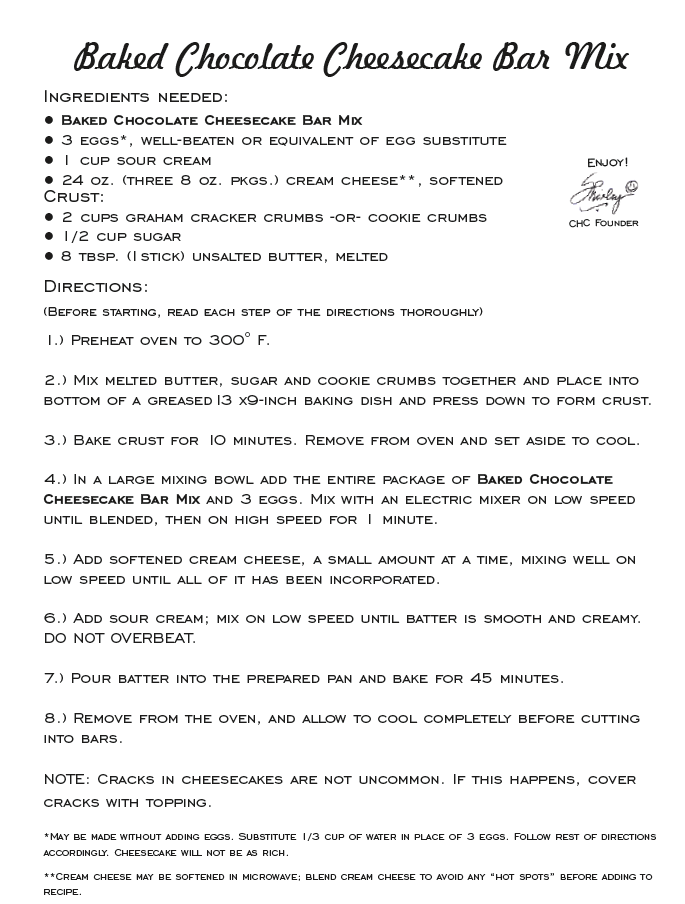 Artisan Kitchen Baked Chocolate Cheesecake Bars Mix (1/2 Dozen)