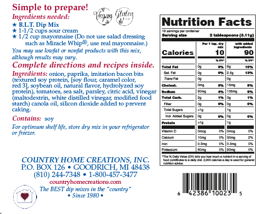 Elevate your snack game with our BLT dip mix, a deliciously indulgent take on the beloved American classic. Loaded with crispy bacon bits and bursting with flavor, this easy-to-make dip is the perfect addition to any party spread. Try it with white bread cubes or potato chips. Great for game day, get-togethers, and picnics. Check out our popular recipes for this mix, like B.L.T. Rollups or B.L.T. Pizza!