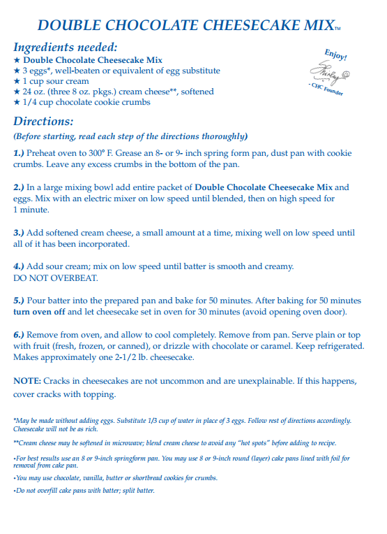Introducing our delectable New York style Double Chocolate Cheesecake Mix! Made with premium cocoa and real chocolate chips throughout, this rich and indulgent dessert is a chocolate lover's dream. With its easy preparation and baked goodness, you can enjoy a taste of New York right in the comfort of your own home. Treat yourself to a slice of pure chocolate bliss with our double chocolate cheesecake today!