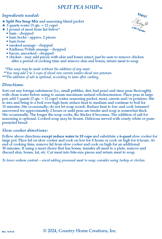 This gourmet blend will change your outlook on pea soup! There's no pre-soaking and no fuss, but a whole lot of flavor. Ready to eat in just under 2 hours.